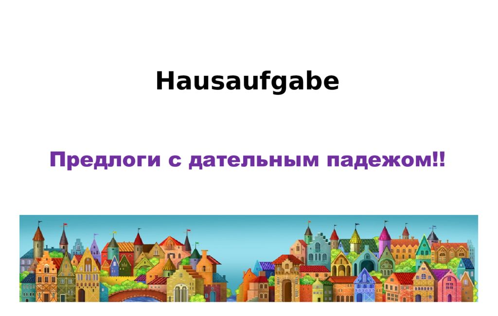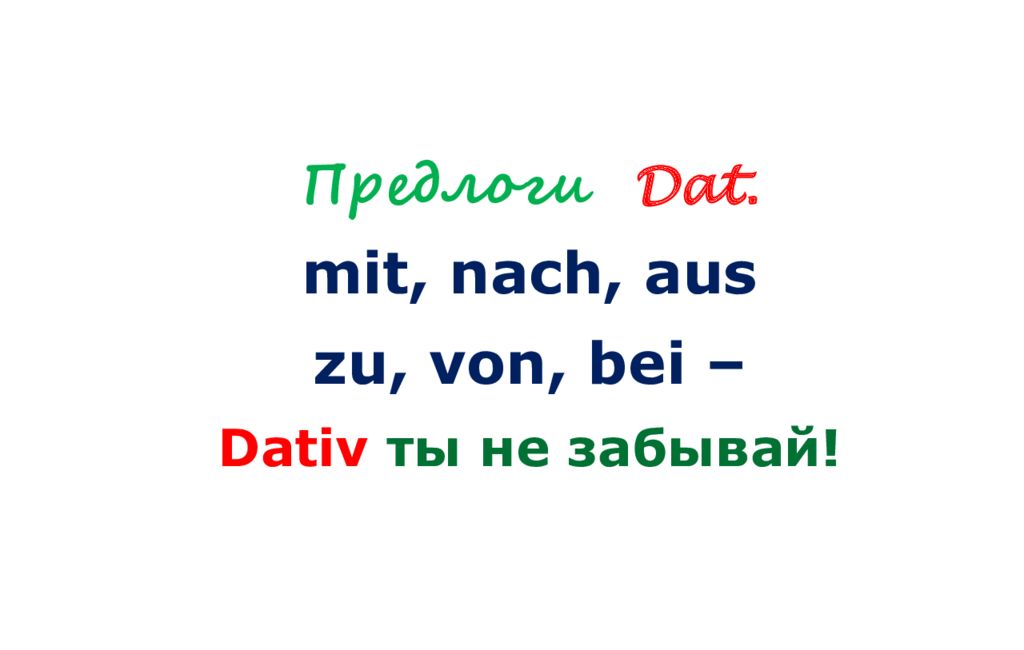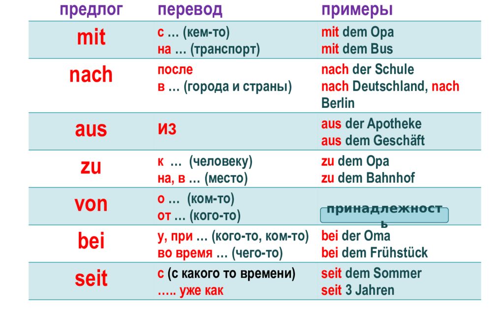 предлог перевод примеры mit с … (кем- то) на … (транспорт) mit dem Opa mit dem Bus nach после в … (города и страны) nach der Schule nach Deutschland, nach Berlin aus из aus der Apotheke aus dem Gesch äft zu к … (человеку) на, в … (место) zu dem Opa zu dem Bahnhof von о … (ком-то) от … (кого-то) v on der Oma bei у, при … (кого-то, ком-то) во время … (чего-то) bei der Oma bei dem Fr ühstück seit с (с какого то времени) ….. уже как seit dem Sommer seit 3 Jahren принадлежность
