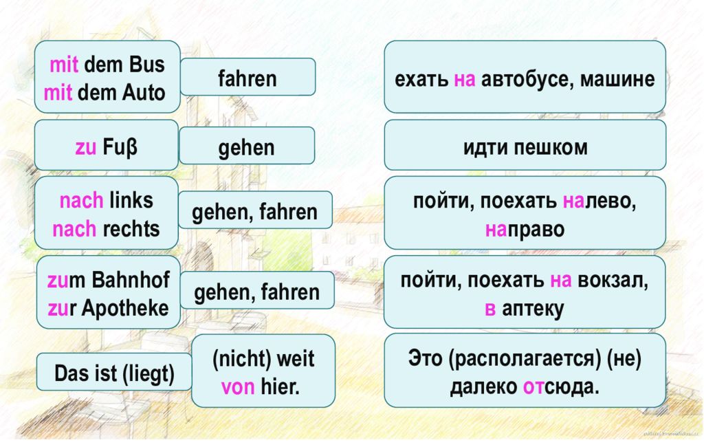 mit dem Bus mit dem Auto fahren zu Fu β nach links nach rechts gehen, fahren gehen zu m Bahnhof zu r Apotheke gehen, fahren (nicht) weit von hier. Das ist ( liegt ) ехать на автобусе, машине идти пешком пойти, поехать на лево, на право пойти, поехать на вокзал, в аптеку Это (располагается) (не) далеко от сюда.