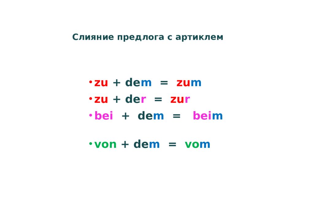 zu + de m = zu m zu + de r = zu r bei + de m = bei m von + de m = vo m