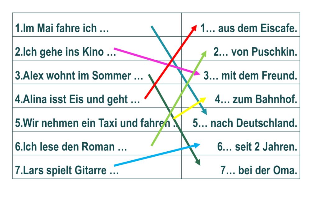 1.Im Mai fahre ich … 1… aus dem Eiscafe. 2.Ich gehe ins Kino … 2… von Puschkin. 3.Alex wohnt im Sommer … 3… mit dem Freund. 4.Alina isst Eis und geht … 4… zu m Bahnhof. 5.Wir nehmen ein Taxi und fahren.. 5… nach Deutschland. 6.Ich lese den Roman … 6… seit 2 Jahren. 7.Lars spielt Gitarre … 7… bei der Oma.