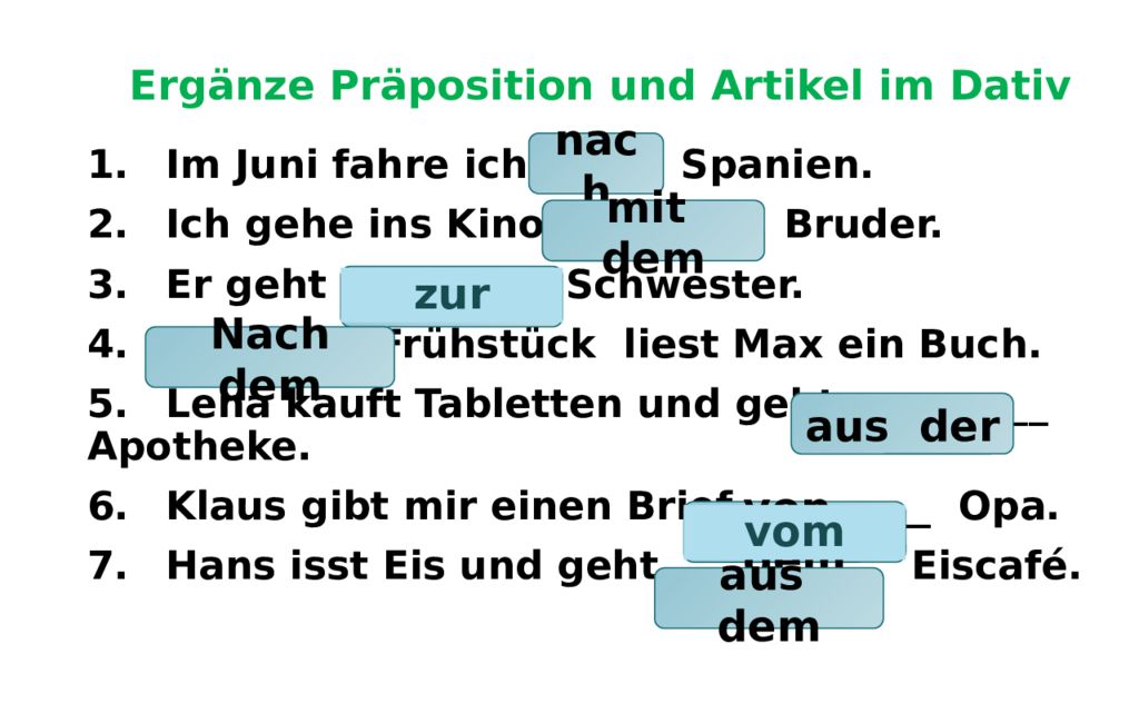 1. Im Juni fahre ich _____ Spanien. 2. Ich gehe ins Kino ____ ____ Bruder. 3. Er geht ____ ____ Schwester. 4. ____ ____ Frühstück liest Max ein Buch. 5. Lena kauft Tabletten und geht ____ ____ Apotheke. 6. Klaus gibt mir einen Brief ____ ____ Opa. 7. Hans isst Eis und geht ____ ____ Eiscafé. nach mit dem zu der Nach dem aus der von dem aus de m zur vom