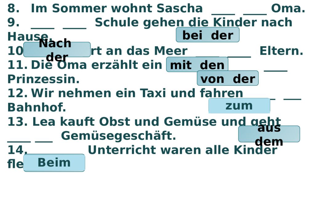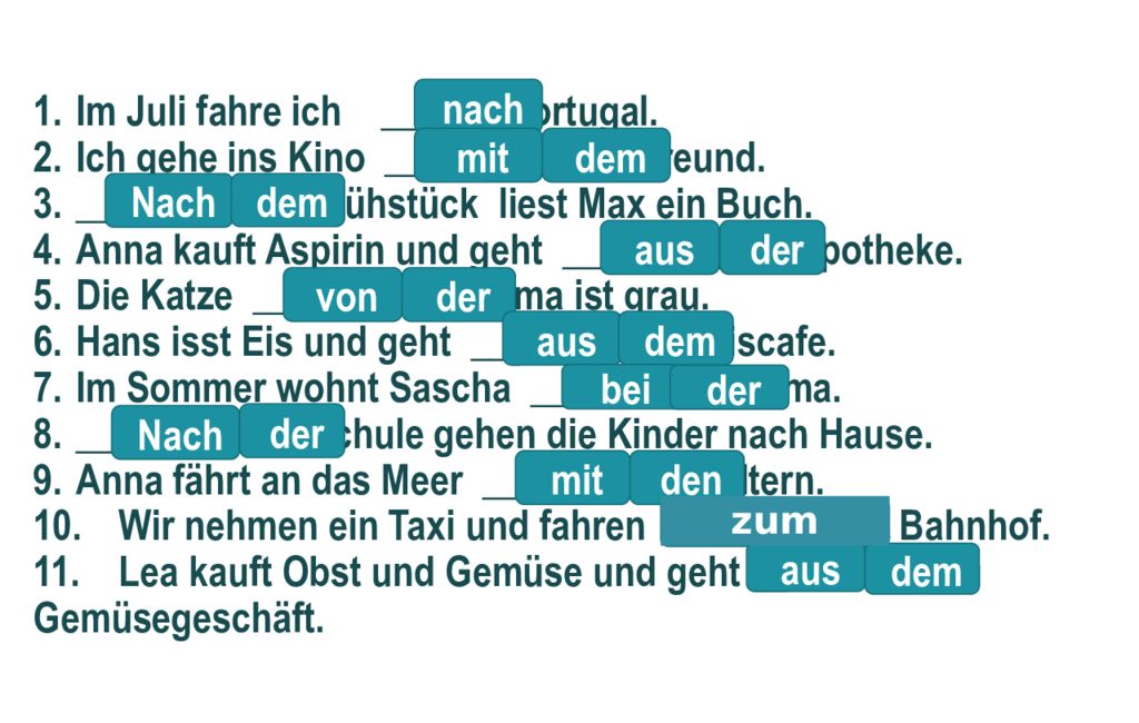1. Im Juli fahre ich _____ Portugal. 2. Ich gehe ins Kino _____ _____ Freund. 3. _____ _____ Frühstück liest Max ein Buch. 4. Anna kauft Aspirin und geht _____ _____ Apotheke. 5. Die Katze _____ _____ Oma ist grau. 6. Hans isst Eis und geht _____ _____ Eiscafe. 7. Im Sommer wohnt Sascha _____ _____ Oma. 8. _____ _____ Schule gehen die Kinder nach Hause. 9. Anna fährt an das Meer _____ _____ Eltern. 10. Wir nehmen ein Taxi und fahren _____ _____ Bahnhof. 11. Lea kauft Obst und Gemüse und geht _____ _____ Gemüsegeschäft. nach mit dem Nach dem aus der von der aus dem bei der Nach der mit den zu dem aus dem zum