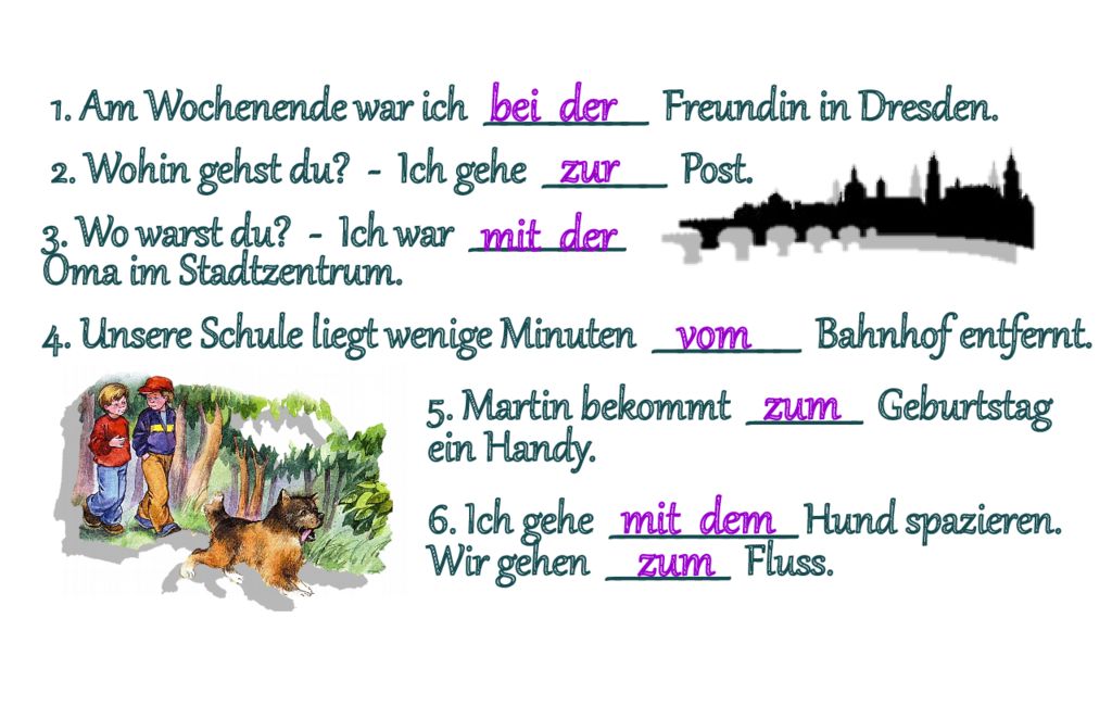 1. Am Wochenende war ich ____________________ Freundin in Dresden. 2. Wohin gehst du? - Ich gehe _______________ Post. bei der 3. Wo warst du? - Ich war ___________________ Oma im Stadtzentrum. 4. Unsere Schule liegt wenige Minuten __________________ Bahnhof entfernt. 5. Martin bekommt ______________ Geburtstag ein Handy. 6. Ich gehe _______________________ Hund spazieren. Wir gehen _______________ Fluss. zur mit der vom zum mit dem zum