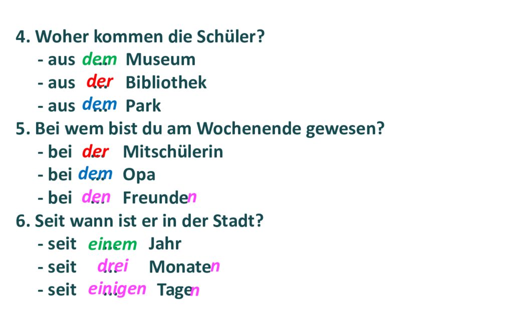 4. Woher kommen die Schüler? - aus... Museum - aus... Bibliothek - aus... Park 5. Bei wem bist du am Wochenende gewesen? - bei... Mitschülerin - bei... Opa - bei... Freunde 6. Seit wann ist er in der Stadt? - seit... Jahr - seit... Monate - seit... Tage dem der dem der dem den n einem drei n einigen n
