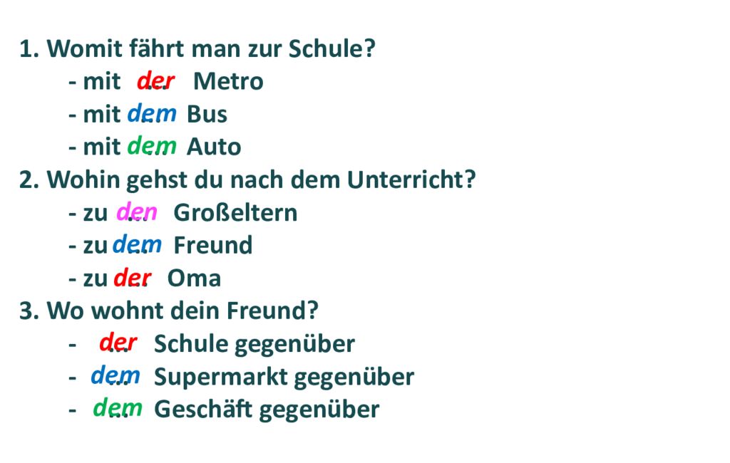 1. Womit fährt man zur Schule? - mit... Metro - mit... Bus - mit... Auto 2. Wohin gehst du nach dem Unterricht? - zu... Großeltern - zu... Freund - zu... Oma 3. Wo wohnt dein Freund? -... Schule gegenüber -... Supermarkt gegenüber -... Geschäft gegenüber der dem dem den dem der der dem dem