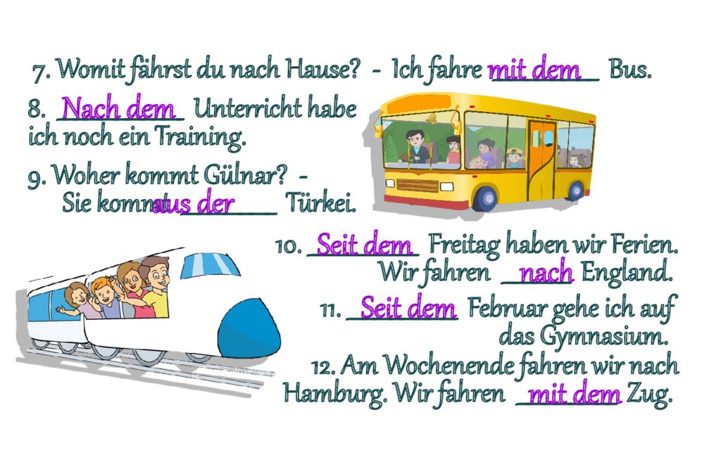 7. Womit fährst du nach Hause? - Ich fahre ____________________ Bus. mit dem 8. ________________________ Unterricht habe ich noch ein Training. Nach dem 9. Woher kommt Gülnar ? - Sie kommt __________________ Türkei. aus der 10. _____________________ Freitag haben wir Ferien. Wir fahren _____________ England. Seit dem nach 11. _____________________ Februar gehe ich auf das Gymnasium. Seit dem 12. Am Wochenende fahren wir nach Hamburg. Wir fahren ___________________ Zug. mit dem