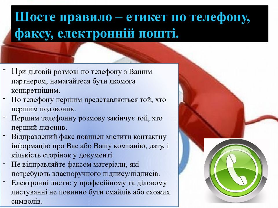 Шосте правило – етикет по телефону, факсу, електронній пошті. П ри діловій розмові по телефону з Вашим партнером, намагайтеся бути якомога конкретнішим. По телефону першим представляється той, хто першим подзвонив. Першим телефонну розмову закінчує той, хто перший дзвонив. Відправлений факс повинен містити контактну інформацію про Вас або Вашу компанію, дату, і кількість сторінок у документі. Не відправляйте факсом матеріали, які потребують власноручного підпису / підписів. Електронні листи : у професійному та діловому листуванні не повинно бути смайлів або схожих символів.
