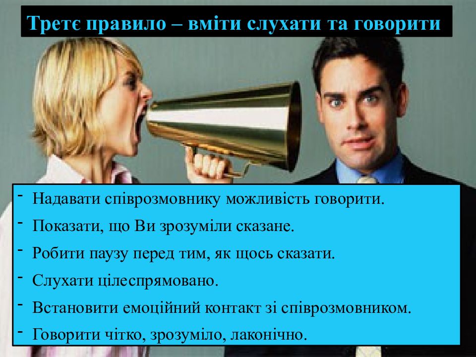 Третє правило – вміти слухати та говорити Надавати співрозмовнику можливість говорити. Показати, що В и зрозуміли сказане. Робити паузу перед тим, як щось сказати. Слухати цілеспрямовано. Встановити емоційний контакт зі співрозмовником. Говорити чітко, зрозуміло, лаконічно.
