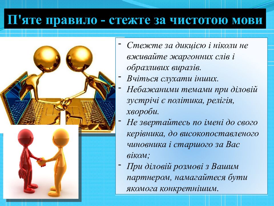 П'яте правило - стежте за чистотою мови Стежте за дикцією і ніколи не вживайте жаргонних слів і образливих виразів. Вчіться слухати інших. Небажаними темами при діловій зустрічі є політика, релігія, хвороби. Не звертайтесь по імені до свого керівника, до високопоставленого чиновника і старшого за Вас віком ; При діловій розмові з Вашим партнером, намагайтеся бути якомога конкретнішим.