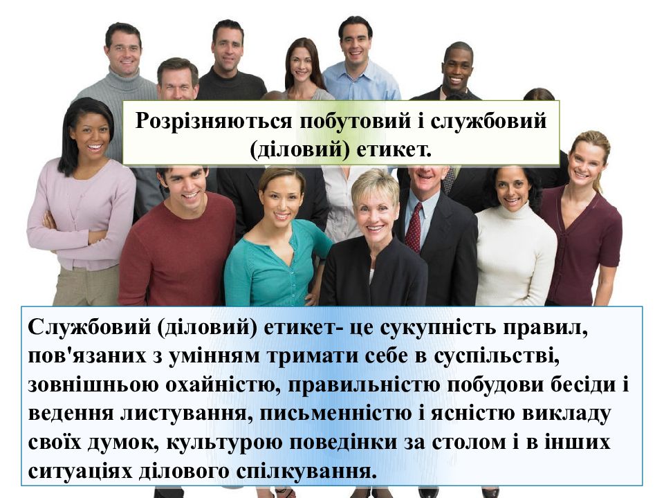 Р озрізняються побутовий і службовий ( діловий ) етикет. Службовий ( діловий ) етикет - це сукупність правил, пов'язаних з умінням тримати себе в суспільстві, зовнішньою охайністю, правильністю побудови бесіди і ведення листування, письменністю і ясністю викладу своїх думок, культурою поведінки за столом і в інших ситуаціях ділового спілкування.