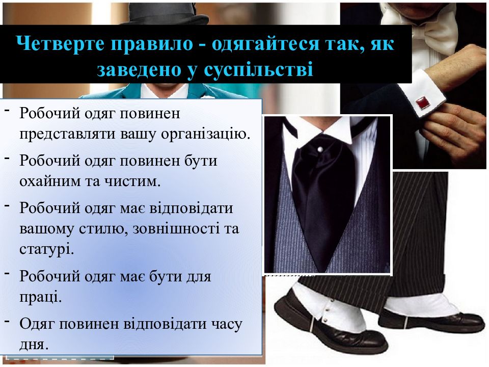 Четверте правило - одягайтеся так, як заведено у суспільстві Робочий одяг повинен представляти вашу організацію. Робочий одяг повинен бути охайним та чистим. Робочий одяг має відповідати вашому стилю, зовнішності та статурі. Робочий одяг має бути для праці. Одяг повинен відповідати часу дня.