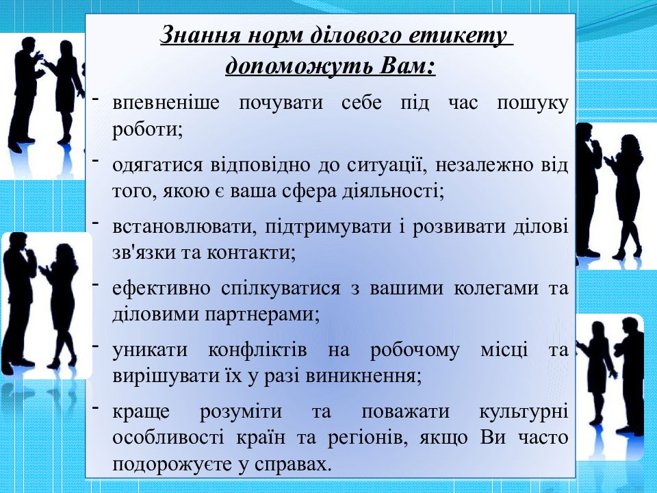 Знання норм ділового етикету допоможуть Вам: впевненіше почувати себе під час пошуку роботи ; одягатися відповідно до ситуації, незалежно від того, якою є ваша сфера діяльності ; встановлювати, підтримувати і розвивати ділові зв'язки та контакти ; ефективно спілкуватися з вашими колегами та діловими партнерами; уникати конфліктів на робочому місці та вирішувати їх у разі виникнення ; краще розуміти та поважати культурні особливості країн та регіонів, якщо В и часто подорожуєте у справах.