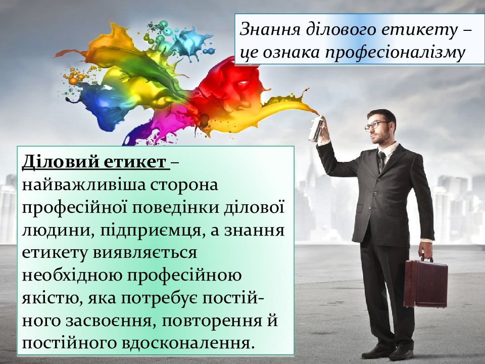 Знання д ілового етикету – це ознака професіоналізму Діловий етикет – найважливіша сторона професійно ї поведінки ділової людини, підприємця, а знання етикету виявляється необхідною професійною якістю, яка потребує постій-ного засвоєння, повторення й постійного вдосконалення.