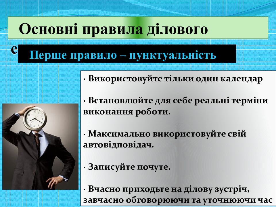 О сновні правила ділового етикету: Перше правило – пунктуальність · Використовуйте тільки один календар · Встановлюйте для себе реальні терміни виконання роботи. · Максимально використовуйте свій автовідповідач. · Записуйте почуте. · В часно приходьте на ділову зустріч, завчасно обговорюючи та уточнюючи час