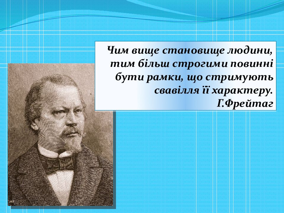 Чим вище становище людини, тим більш строгими повинні бути рамки, що стримують свавілля її характеру. Г. Фрейтаг