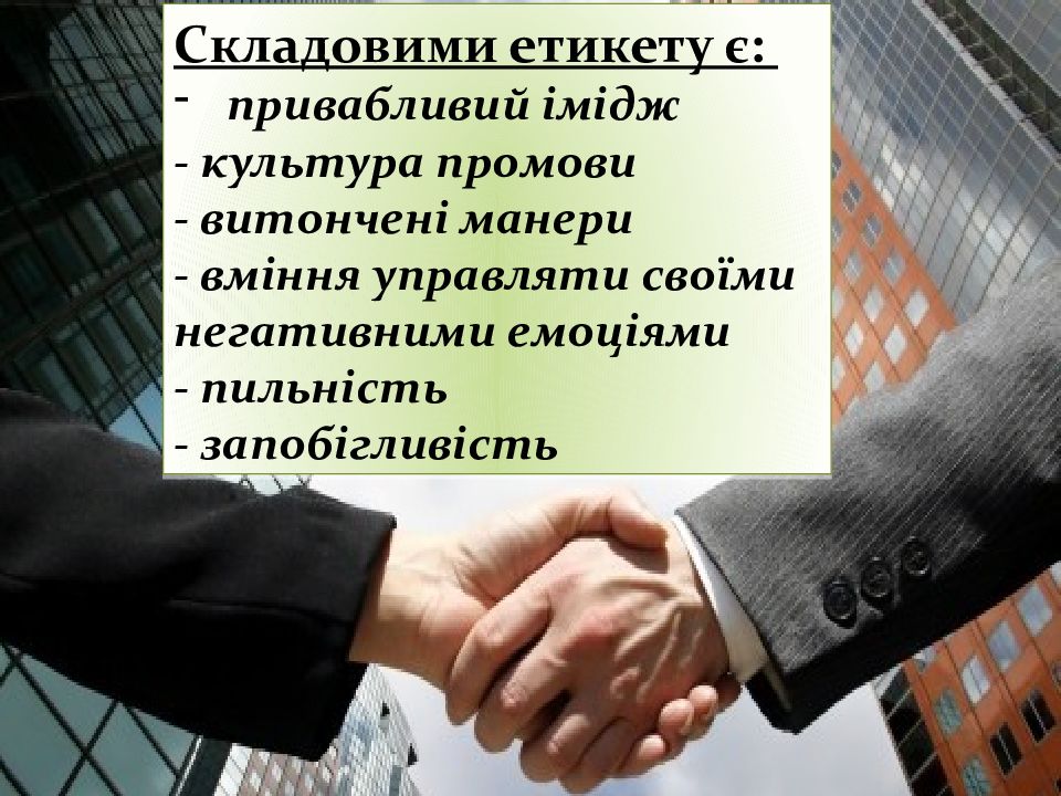 Складовими етикету є: привабливий імідж - культура промови - витончені манери - вміння управляти своїми негативними емоціями - пильність - запобігливість