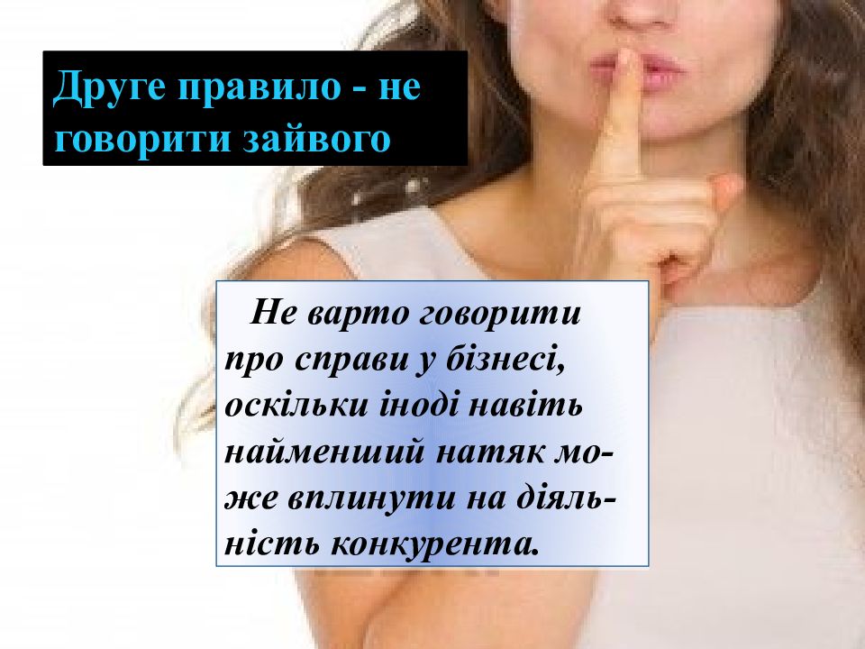Друге правило - не говорити зайвого Не варто говорити про справи у бізнесі, оскільки іноді навіть найменший натяк мо-же вплинути на діяль-ність конкурента.