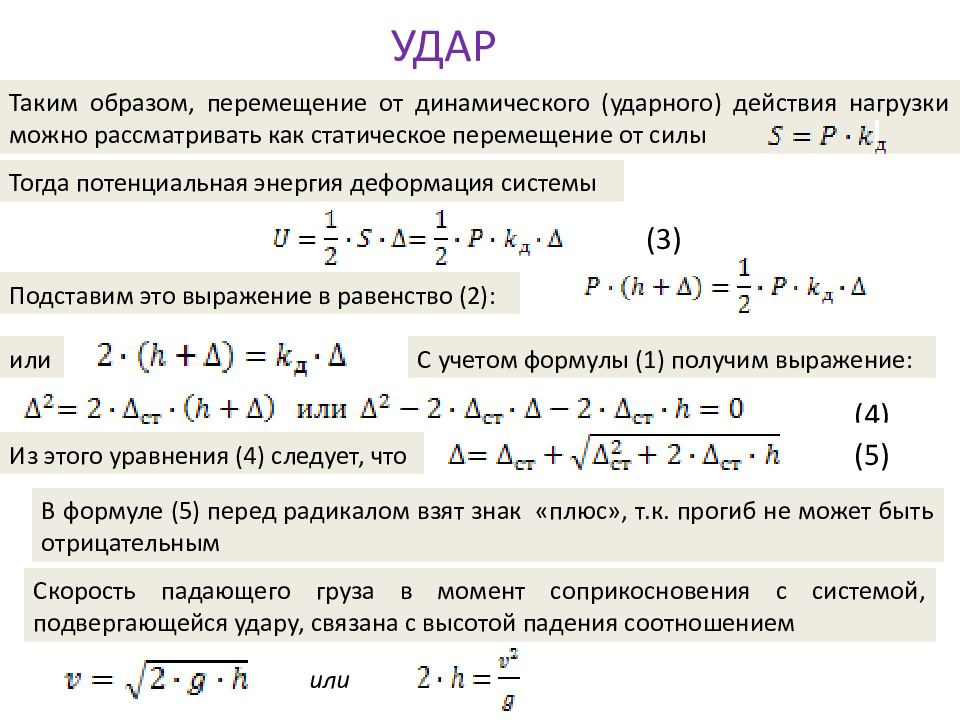 Таким образом, перемещение от динамического (ударного) действия нагрузки можно рассматривать как статическое перемещение от силы УДАР Тогда потенциальная энергия деформация системы Подставим это выражение в равенство (2): или С учетом формулы (1) получим выражение: (3) Из этого уравнения (4) следует, что (4) В формуле (5) перед радикалом взят знак «плюс», т.к. прогиб не может быть отрицательным Скорость падающего груза в момент соприкосновения с системой, подвергающейся удару, связана с высотой падения соотношением (5) или