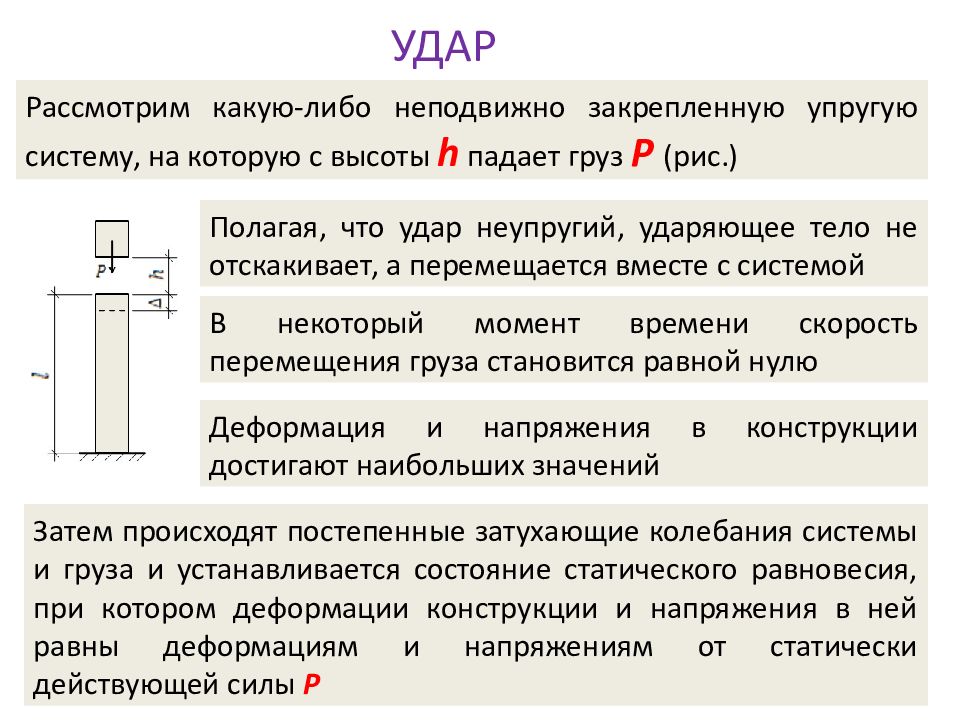 Рассмотрим какую-либо неподвижно закрепленную упругую систему, на которую с высоты h падает груз Р (рис.) Полагая, что удар неупругий, ударяющее тело не отскакивает, а перемещается вместе с системой УДАР В некоторый момент времени скорость перемещения груза становится равной нулю Деформация и напряжения в конструкции достигают наибольших значений Затем происходят постепенные затухающие колебания системы и груза и устанавливается состояние статического равновесия, при котором деформации конструкции и напряжения в ней равны деформациям и напряжениям от статически действующей силы Р