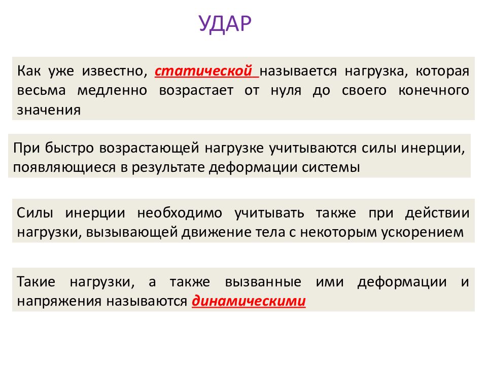Как уже известно, статической называется нагрузка, которая весьма медленно возрастает от нуля до своего конечного значения УДАР При быстро возрастающей нагрузке учитываются силы инерции, появляющиеся в результате деформации системы Силы инерции необходимо учитывать также при действии нагрузки, вызывающей движение тела с некоторым ускорением Такие нагрузки, а также вызванные ими деформации и напряжения называются динамическими