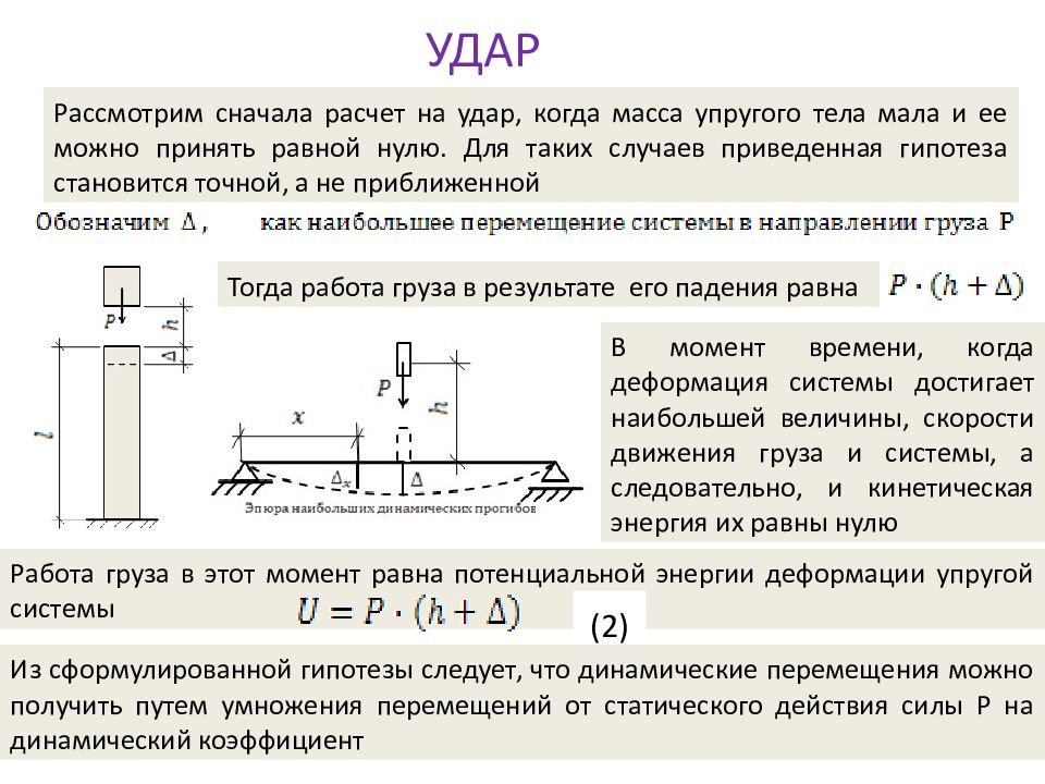 Рассмотрим сначала расчет на удар, когда масса упругого тела мала и ее можно принять равной нулю. Для таких случаев приведенная гипотеза становится точной, а не приближенной Тогда работа груза в результате его падения равна В момент времени, когда деформация системы достигает наибольшей величины, скорости движения груза и системы, а следовательно, и кинетическая энергия их равны нулю Работа груза в этот момент равна потенциальной энергии деформации упругой системы (2) Из сформулированной гипотезы следует, что динамические перемещения можно получить путем умножения перемещений от статического действия силы Р на динамический коэффициент
