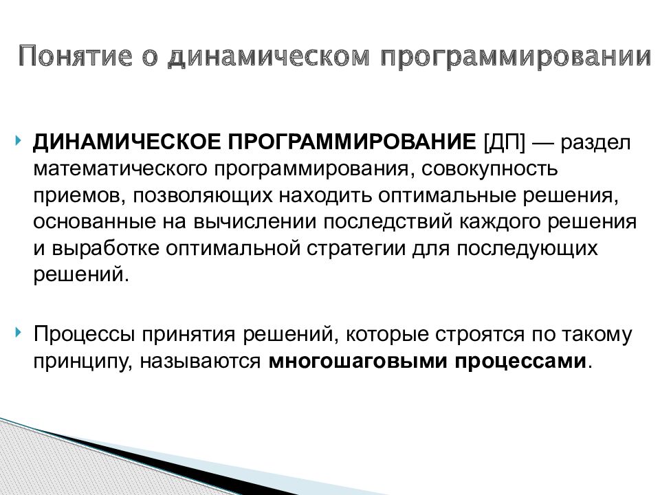 ДИНАМИЧЕСКОЕ ПРОГРАММИРОВАНИЕ [ДП] — раздел математического программирования, совокупность приемов, позволяющих находить оптимальные решения, основанные на вычислении последствий каждого решения и выработке оптимальной стратегии для последующих решений. Процессы принятия решений, которые строятся по такому принципу, называются многошаговыми процессами. Понятие о динамическом программировании