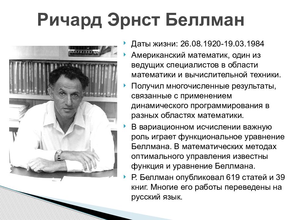 Даты жизни: 26.08.1920-19.03.1984 Американский математик, один из ведущих специалистов в области математики и вычислительной техники. Получил многочисленные результаты, связанные с применением динамического программирования в разных областях математики. В вариационном исчислении важную роль играет функциональное уравнение Беллмана. В математических методах оптимального управления известны функция и уравнение Беллмана. Р. Беллман опубликовал 619 статей и 39 книг. Многие его работы переведены на русский язык.