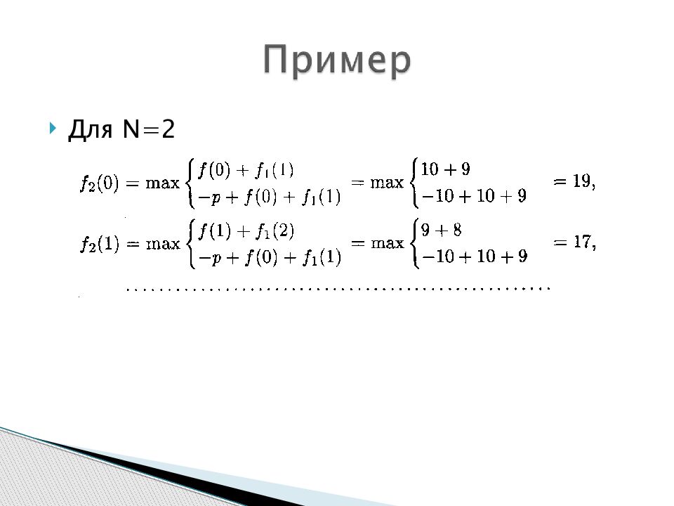 2-й этап. Инвестиции выделяем первому и второму предприятиям. Рекуррентное соотношение для 2-го этапа имеет вид Тогда при х = 20 f 2 (20) = max (8+0, 0+10) = max (8, 10) = 10, при x = 40 f 2 (40) = max (16, 8+10, 20) = max (16, 18, 20) =20, при х = 60 f 2 (60) = max (25, 16+10, 8+20, 28) = max (25, 26, 28, 28) =28, при х = 80 f 2 (80) = max (36, 25+10,16+20, 8+28, 40) = max (36, 35, 36, 36, 40) = 40, при х = 100 f 2 (100) = max (44, 36+10, 25+20,16+28, 8+40, 48) = max (44, 46, 45, 44, 48, 48) = 48, при х = 120 f 2 (120) = max (62, 44+10, 36+20, 25+28,16+40, 8+48, 62) = max (62, 54, 56, 53, 56, 56, 62) = 62.