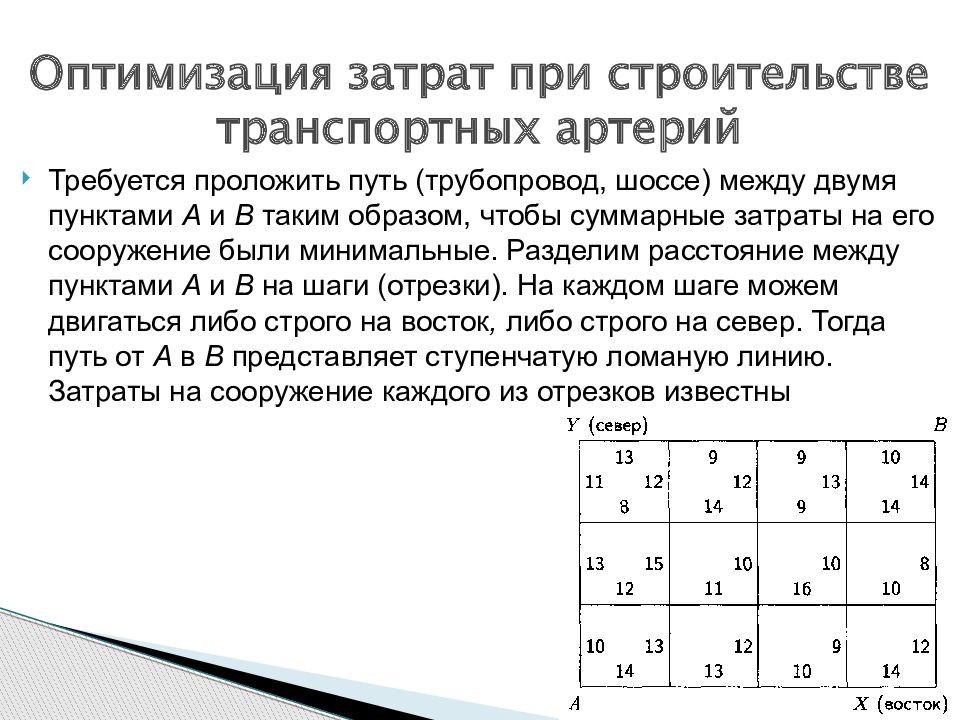 Требуется проложить путь (трубопровод, шоссе) между двумя пунктами А и В таким образом, чтобы суммарные затраты на его сооружение были минимальные. Разделим расстояние между пунктами А и В на шаги (отрезки). На каждом шаге можем двигаться либо строго на восток, либо строго на север. Тогда путь от А в В представляет ступенчатую ломаную линию. Затраты на сооружение каждого из отрезков известны Оптимизация затрат при строительстве транспортных артерий