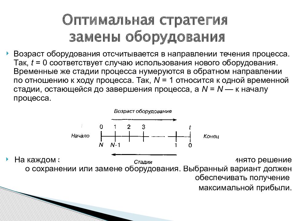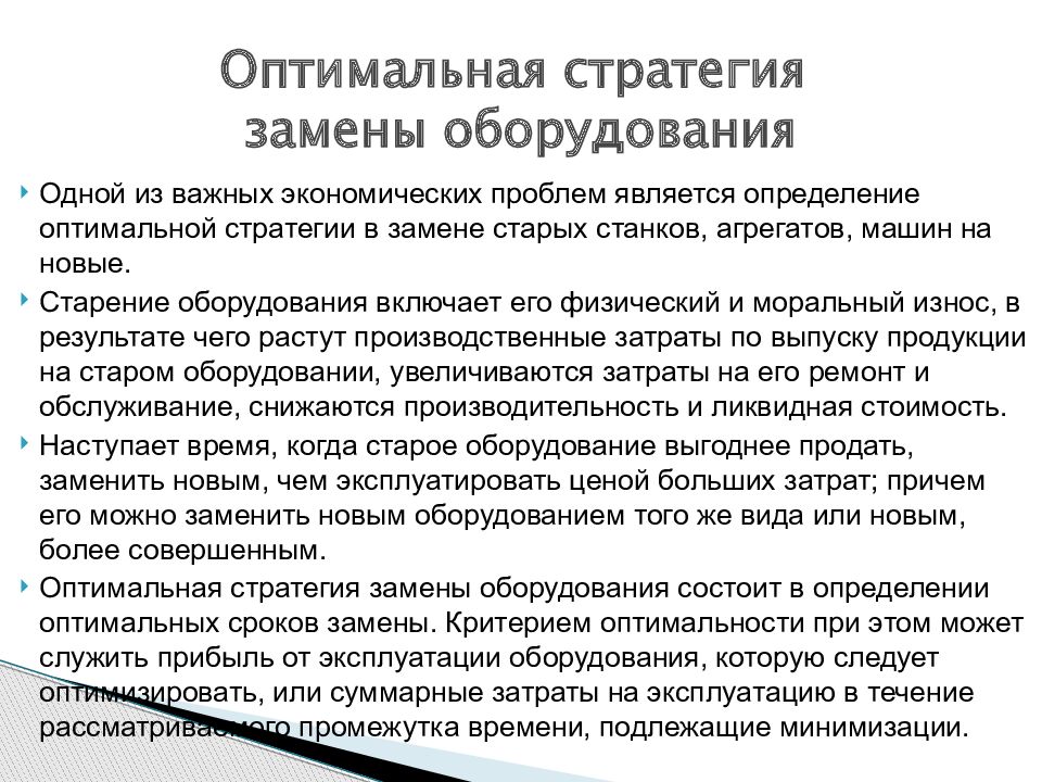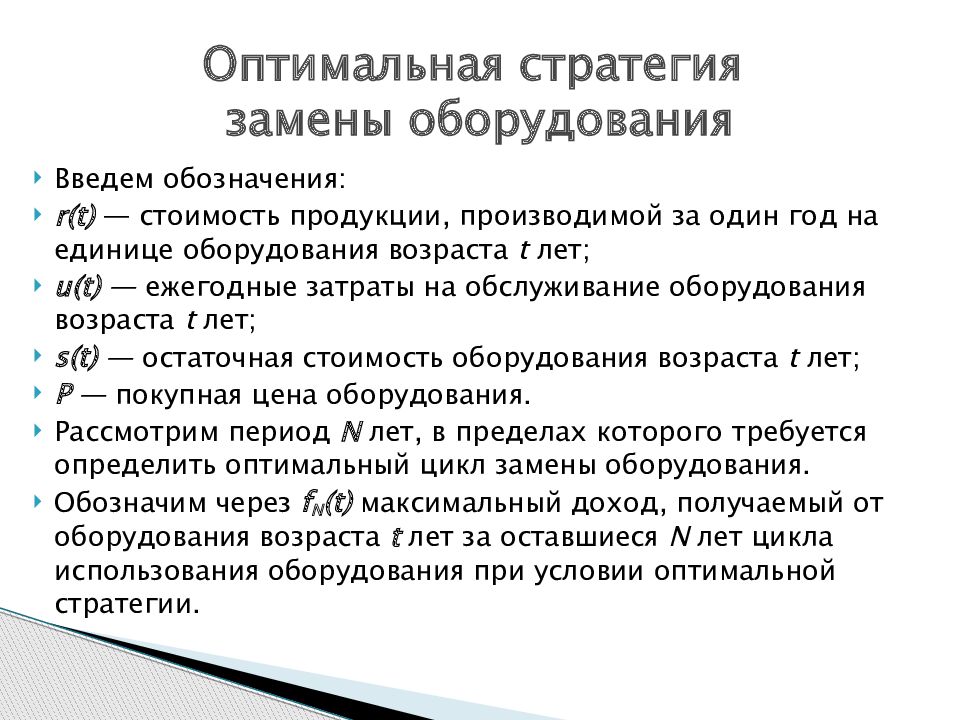Одной из важных экономических проблем является определение оптимальной стратегии в замене старых станков, агрегатов, машин на новые. Старение оборудования включает его физический и моральный износ, в результате чего растут производственные затраты по выпуску продукции на старом оборудовании, увеличиваются затраты на его ремонт и обслуживание, снижаются производительность и ликвидная стоимость. Наступает время, когда старое оборудование выгоднее продать, заменить новым, чем эксплуатировать ценой больших затрат; причем его можно заменить новым оборудованием того же вида или новым, более совершенным. Оптимальная стратегия замены оборудования состоит в определении оптимальных сроков замены. Критерием оптимальности при этом может служить прибыль от эксплуатации оборудования, которую следует оптимизировать, или суммарные затраты на эксплуатацию в течение рассматриваемого промежутка времени, подлежащие минимизации. Оптимальная стратегия замены оборудования