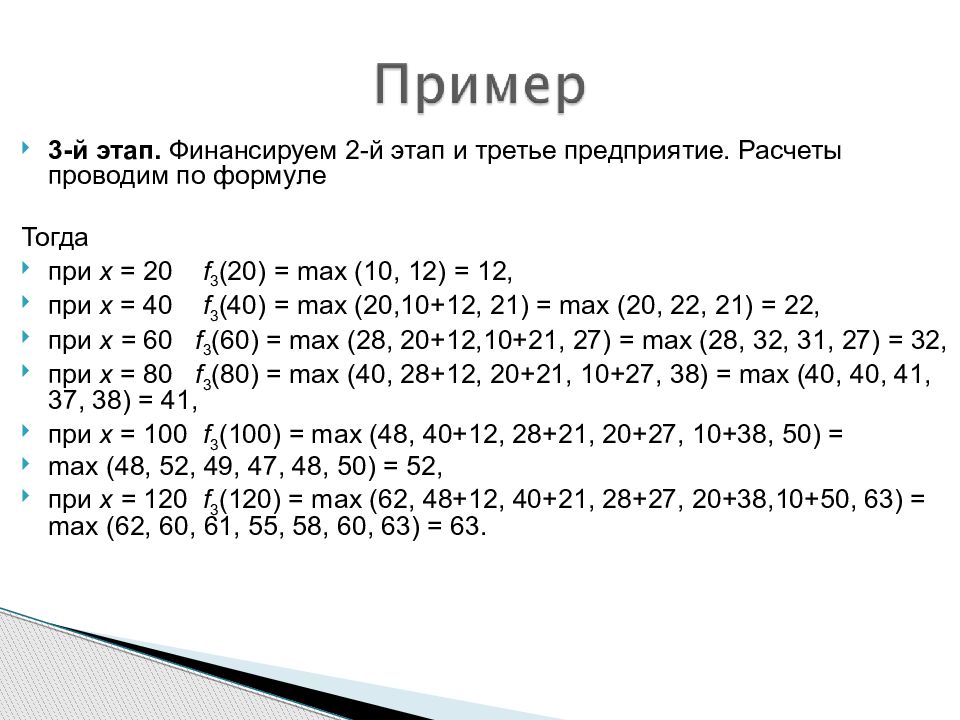 3-й этап. Финансируем 2-й этап и третье предприятие. Расчеты проводим по формуле Тогда при х = 20 f 3 (20) = m ах (10, 12) = 12, при x = 40 f 3 (40) = max (20,10+12, 21) = max (20, 22, 21) = 22, при х = 60 f 3 (60) = max (28, 20+12,10+21, 27) = max (28, 32, 31, 27) = 32, при х = 80 f 3 (80) = max (40, 28+12, 20+21, 10+27, 38) = max (40, 40, 41, 37, 38) = 41, при x = 100 f 3 (100) = max (48, 40+12, 28+21, 20+27, 10+38, 50) = max (48, 52, 49, 47, 48, 50) = 52, при х = 120 f 3 (120) = max (62, 48+12, 40+21, 28+27, 20+38,10+50, 63) = max (62, 60, 61, 55, 58, 60, 63) = 63.