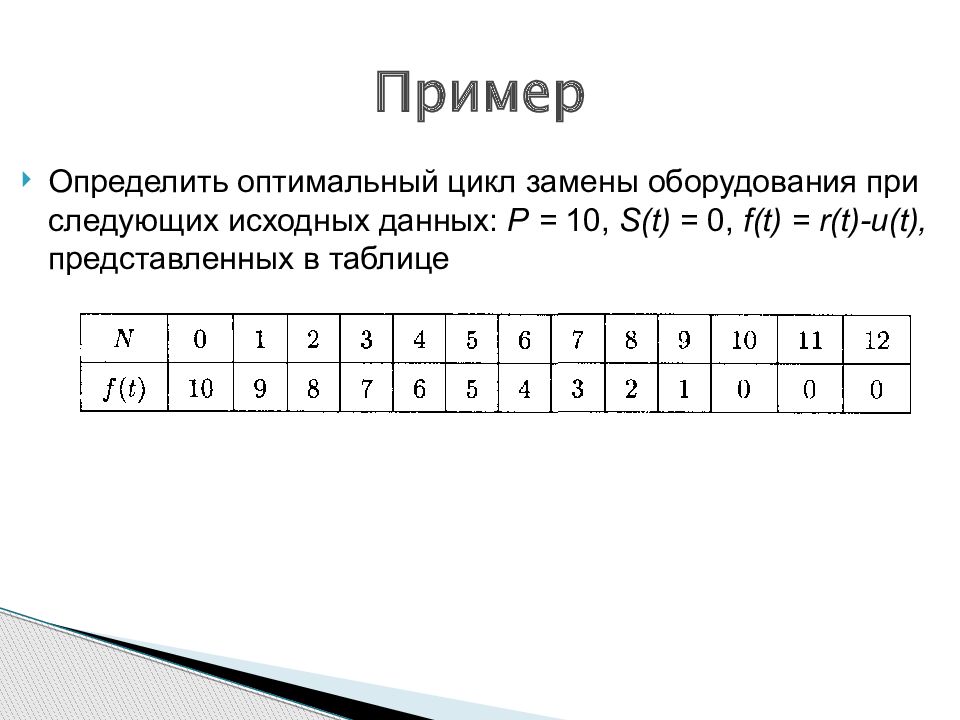 Определить оптимальный цикл замены оборудования при следующих исходных данных: Р = 10, S ( t ) = 0, f ( t ) = r ( t )- u ( t ), представленных в таблице Пример