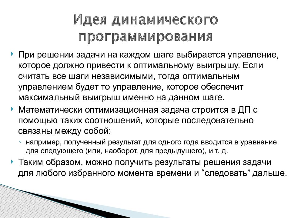 При решении задачи на каждом шаге выбирается управление, которое должно привести к оптимальному выигрышу. Если считать все шаги независимыми, тогда оптимальным управлением будет то управление, которое обеспечит максимальный выигрыш именно на данном шаге. Математически оптимизационная задача строится в ДП с помощью таких соотношений, которые последовательно связаны между собой: например, полученный результат для одного года вводится в уравнение для следующего (или, наоборот, для предыдущего), и т. д. Таким образом, можно получить результаты решения задачи для любого избранного момента времени и “следовать” дальше. Идея динамического программирования