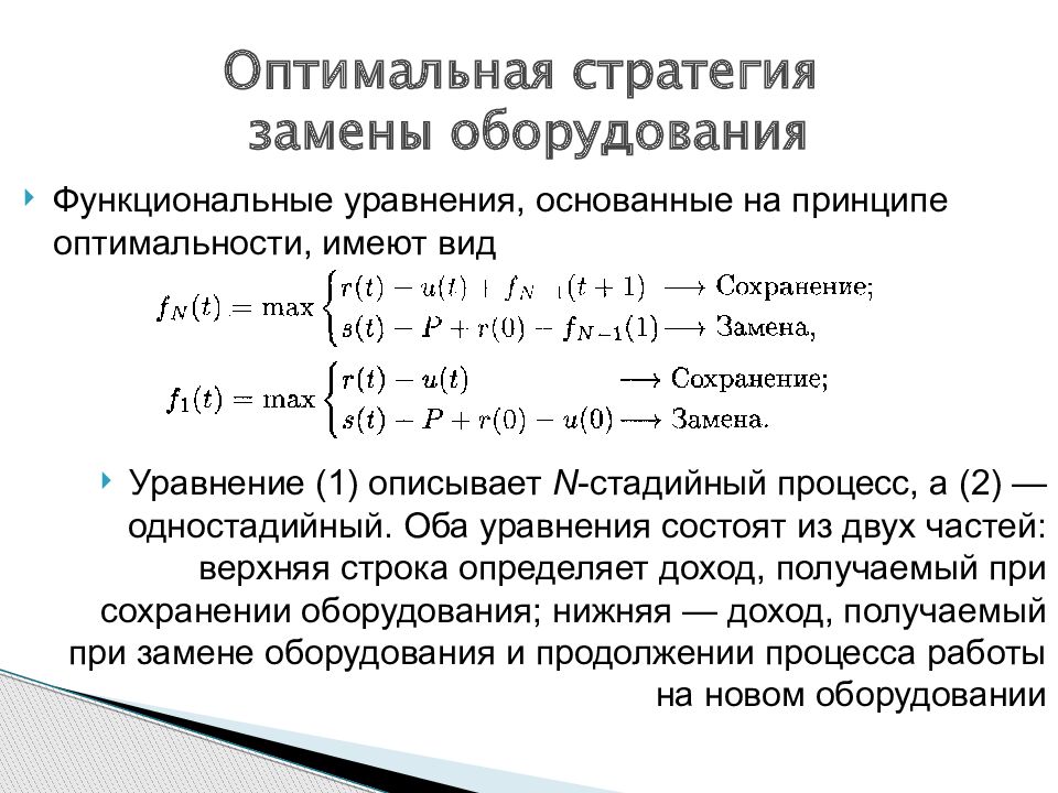 Функциональные уравнения, основанные на принципе оптимальности, имеют вид Уравнение (1) описывает N -стадийный процесс, а (2) — одностадийный. Оба уравнения состоят из двух частей: верхняя строка определяет доход, получаемый при сохранении оборудования; нижняя — доход, получаемый при замене оборудования и продолжении процесса работы на новом оборудовании Оптимальная стратегия замены оборудования