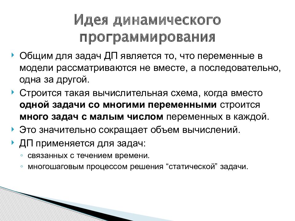 Общим для задач ДП является то, что переменные в модели рассматриваются не вместе, а последовательно, одна за другой. Строится такая вычислительная схема, когда вместо одной задачи со многими переменными строится много задач с малым числом переменных в каждой. Это значительно сокращает объем вычислений. ДП применяется для задач: связанных с течением времени. многошаговым процессом решения “статической” задачи. Идея динамического программирования