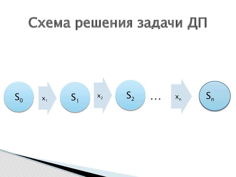 Обозначим S 0 – начальное состояние системы, S n - конечное. В результате управления система последовательно переводится из начального состояния S 0 в конечное S n. Предположим, что управление можно разбить на n шагов и решение принимается последовательно на каждом шаге, а управление представляет собой совокупность n пошаговых управлений. На каждом шаге необходимо определить два типа переменных: переменную состояния системы S k - определяет, в каких состояниях может оказаться система на рассматриваемом k -м шаге; переменную управления x k - в зависимости от состояния S на этом шаге можно применить управления, которые удовлетворяют определенным ограничениям и называются допустимыми. X =(x 1, x 2,..., x k,..., x n ) – общее управление, переводящее систему на состояния S 0 в состояние S n, - последовательность пошаговых управлений x k Схема решения задачи ДП