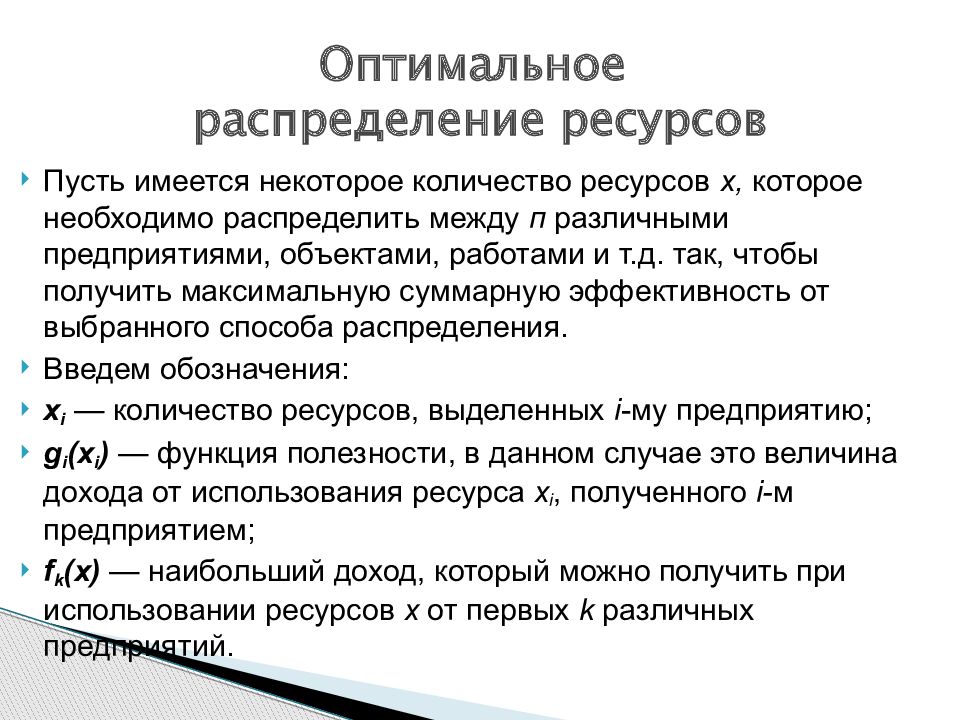 Пусть имеется некоторое количество ресурсов х, которое необходимо распределить между п различными предприятиями, объектами, работами и т.д. так, чтобы получить максимальную суммарную эффективность от выбранного способа распределения. Введем обозначения: x i — количество ресурсов, выделенных i - му предприятию; g i ( x i ) — функция полезности, в данном случае это величина дохода от использования ресурса x i, полученного i- м предприятием; f k ( x ) — наибольший доход, который можно получить при использовании ресурсов х от первых k различных предприятий. Оптимальное распределение ресурсов