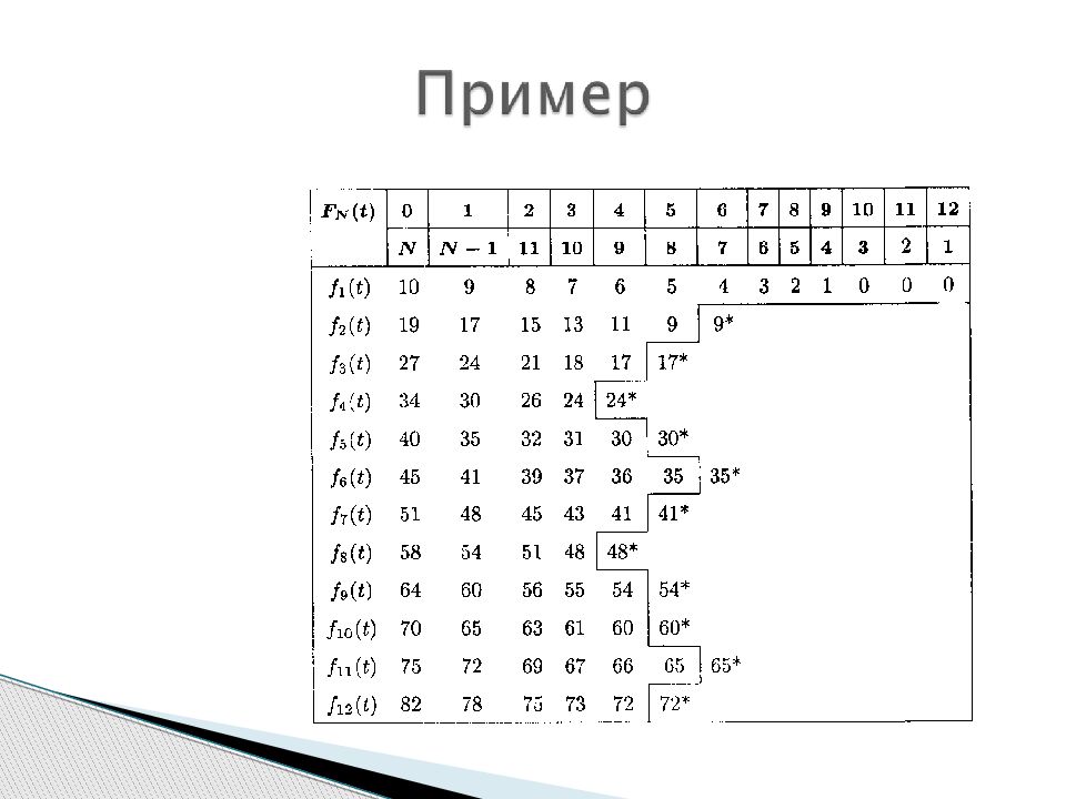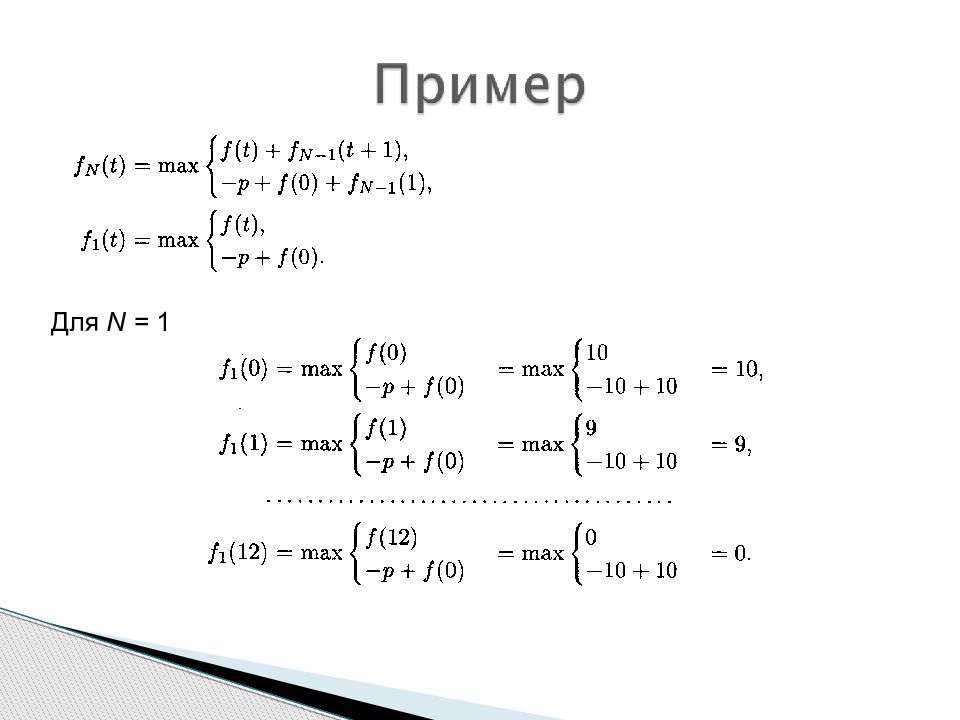 Введем обозначения: r ( t ) — стоимость продукции, производимой за один год на единице оборудования возраста t лет; u ( t ) — ежегодные затраты на обслуживание оборудования возраста t лет; s ( t ) — остаточная стоимость оборудования возраста t лет; Р — покупная цена оборудования. Рассмотрим период N лет, в пределах которого требуется определить оптимальный цикл замены оборудования. Обозначим через f N ( t ) максимальный доход, получаемый от оборудования возраста t лет за оставшиеся N лет цикла использования оборудования при условии оптимальной стратегии. Оптимальная стратегия замены оборудования
