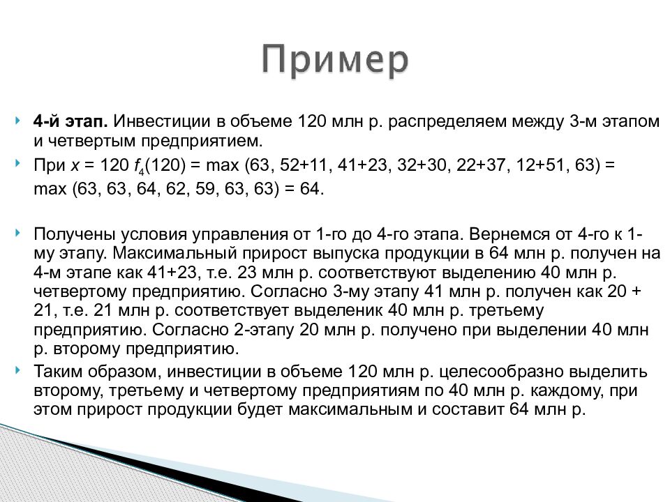 4-й этап. Инвестиции в объеме 120 млн р. распределяем между 3-м этапом и четвертым предприятием. При х = 120 f 4 (120) = max (63, 52+11, 41+23, 32+30, 22+37, 12+51, 63) = max (63, 63, 64, 62, 59, 63, 63) = 64. Получены условия управления от 1-го до 4-го этапа. Вернемся от 4-го к 1-му этапу. Максимальный прирост выпуска продукции в 64 млн р. получен на 4-м этапе как 41+23, т.е. 23 млн р. соответствуют выделению 40 млн р. четвертому предприятию. Согласно 3-му этапу 41 млн р. получен как 20 + 21, т.е. 21 млн р. соответствует выделеник 40 млн р. третьему предприятию. Согласно 2-этапу 20 млн р. получено при выделении 40 млн р. второму предприятию. Таким образом, инвестиции в объеме 120 млн р. целесообразно выделить второму, третьему и четвертому предприятиям по 40 млн р. каждому, при этом прирост продукции будет максимальным и составит 64 млн р.