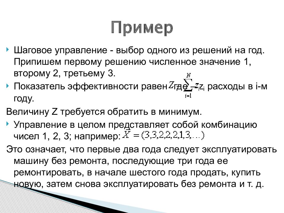 Шаговое управление - выбор одного из решений на год. Припишем первому решению численное значение 1, второму 2, третьему 3. Показатель эффективности равен где – z i расходы в i-м году. Величину Z требуется обратить в минимум. Управление в целом представляет собой комбинацию чисел 1, 2, 3; например: Это означает, что первые два года следует эксплуатировать машину без ремонта, последующие три года ее ремонтировать, в начале шестого года продать, купить новую, затем снова эксплуатировать без ремонта и т. д. Пример