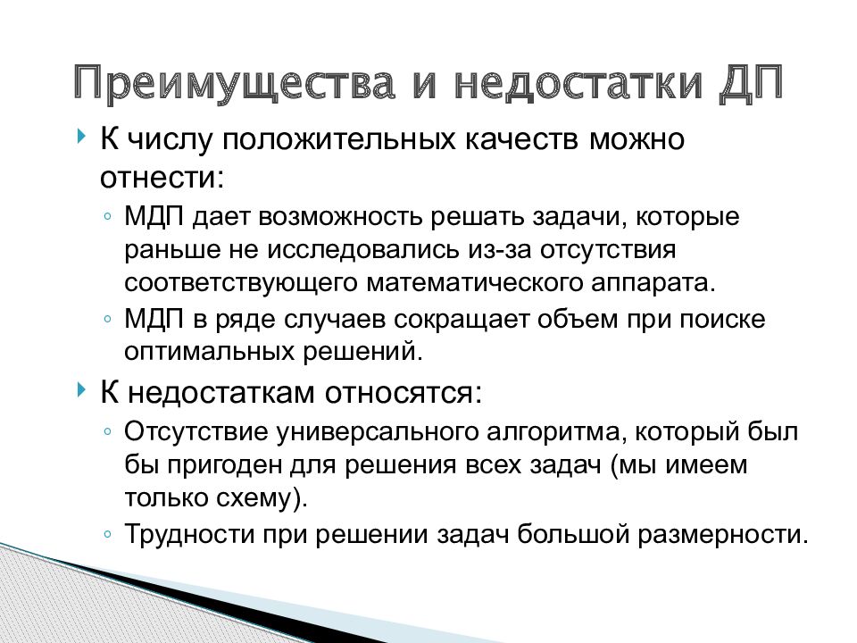 К числу положительных качеств можно отнести: МДП дает возможность решать задачи, которые раньше не исследовались из-за отсутствия соответствующего математического аппарата. МДП в ряде случаев сокращает объем при поиске оптимальных решений. К недостаткам относятся: Отсутствие универсального алгоритма, который был бы пригоден для решения всех задач (мы имеем только схему). Трудности при решении задач большой размерности. Преимущества и недостатки ДП
