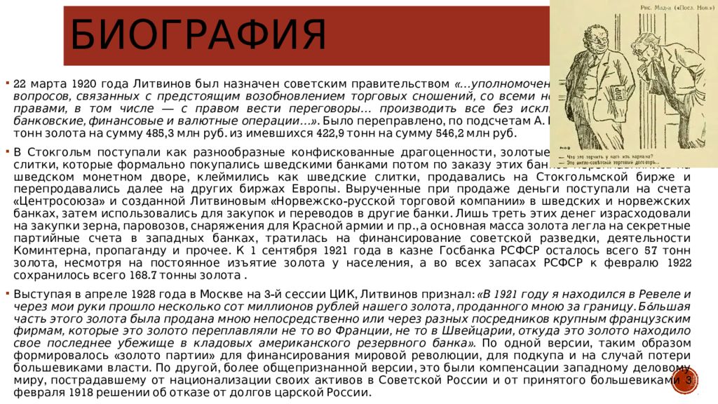 22 марта 1920 года Литвинов был назначен советским правительством «…уполномоченным для решения всех вопросов, связанных с предстоящим возобновлением торговых сношений, со всеми необходимыми для сего правами, в том числе — с правом вести переговоры… производить все без исключения коммерческие, банковские, финансовые и валютные операции …». Было переправлено, по подсчетам А. Г. Мосякина, около 375,7 тонн золота на сумму 485,3 млн руб. из имевшихся 422,9 тонн на сумму 546,2 млн руб. В Стокгольм поступали как разнообразные конфискованные драгоценности, золотые монеты и банковские слитки, которые формально покупались шведскими банками потом по заказу этих банков переплавлялись на шведском монетном дворе, клеймились как шведские слитки, продавались на Стокгольмской бирже и перепродавались далее на других биржах Европы. Вырученные при продаже деньги поступали на счета «Центросоюза» и созданной Литвиновым «Норвежско-русской торговой компании» в шведских и норвежских банках, затем использовались для закупок и переводов в другие банки. Лишь треть этих денег израсходовали на закупки зерна, паровозов, снаряжения для Красной армии и пр., а основная масса золота легла на секретные партийные счета в западных банках, тратилась на финансирование советской разведки, деятельности Коминтерна, пропаганду и прочее. К 1 сентября 1921 года в казне Госбанка РСФСР осталось всего 57 тонн золота, несмотря на постоянное изъятие золота у населения, а во всех запасах РСФСР к февралю 1922 сохранилось всего 168.7 тонны золота. Выступая в апреле 1928 года в Москве на 3-й сессии ЦИК, Литвинов признал: «В 1921 году я находился в Ревеле и через мои руки прошло несколько сот миллионов рублей нашего золота, проданного мною за границу. Бóльшая часть этого золота была продана мною непосредственно или через разных посредников крупным французским фирмам, которые это золото переплавляли не то во Франции, не то в Швейцарии, откуда это золото находило свое последнее убежище в кладовых американского резервного банка ». По одной версии, таким образом формировалось «золото партии» для финансирования мировой революции, для подкупа и на случай потери большевиками власти. По другой, более общепризнанной версии, это были компенсации западному деловому миру, пострадавшему от национализации своих активов в Советской России и от принятого большевиками 3 февраля 1918 решении об отказе от долгов царской России.