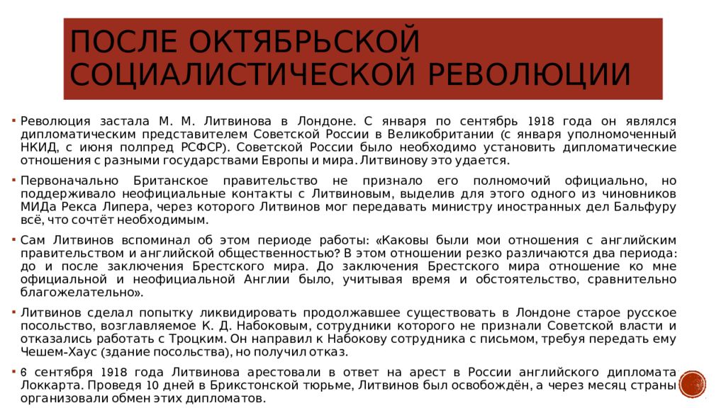 Революция застала М. М. Литвинова в Лондоне. С января по сентябрь 1918 года он являлся дипломатическим представителем Советской России в Великобритании (с января уполномоченный НКИД, с июня полпред РСФСР). Советской России было необходимо установить дипломатические отношения с разными государствами Европы и мира. Литвинову это удается. Первоначально Британское правительство не признало его полномочий официально, но поддерживало неофициальные контакты с Литвиновым, выделив для этого одного из чиновников МИДа Рекса Липера, через которого Литвинов мог передавать министру иностранных дел Бальфуру всё, что сочтёт необходимым. Сам Литвинов вспоминал об этом периоде работы: «Каковы были мои отношения с английским правительством и английской общественностью? В этом отношении резко различаются два периода: до и после заключения Брестского мира. До заключения Брестского мира отношение ко мне официальной и неофициальной Англии было, учитывая время и обстоятельство, сравнительно благожелательно ». Литвинов сделал попытку ликвидировать продолжавшее существовать в Лондоне старое русское посольство, возглавляемое К. Д. Набоковым, сотрудники которого не признали Советской власти и отказались работать с Троцким. Он направил к Набокову сотрудника с письмом, требуя передать ему Чешем-Хаус (здание посольства), но получил отказ. 6 сентября 1918 года Литвинова арестовали в ответ на арест в России английского дипломата Локкарта. Проведя 10 дней в Брикстонской тюрьме, Литвинов был освобождён, а через месяц страны организовали обмен этих дипломатов.