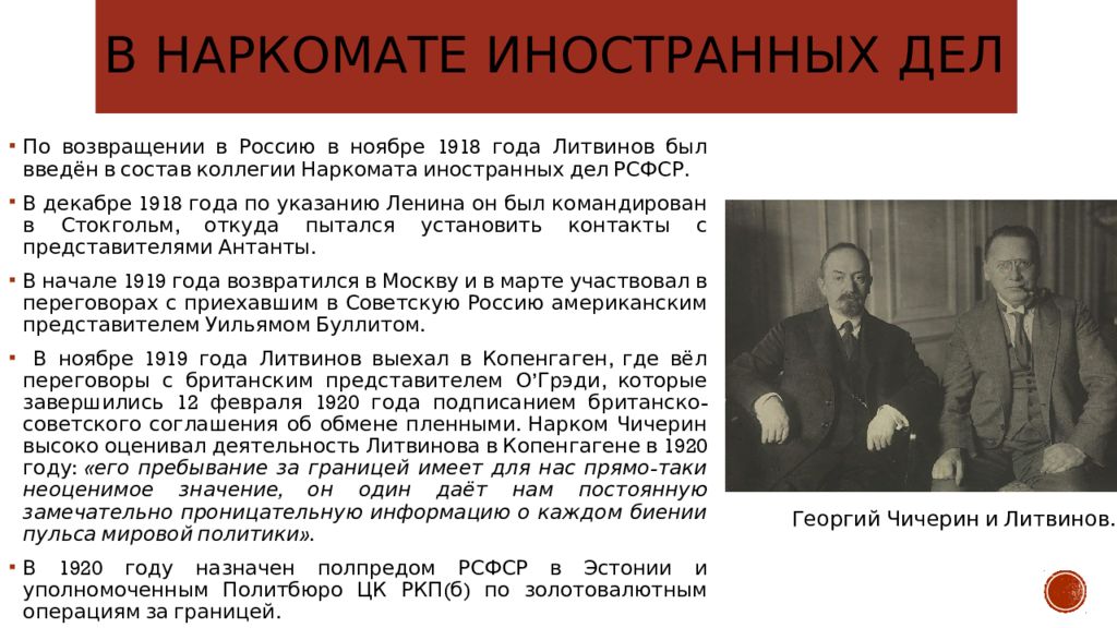 По возвращении в Россию в ноябре 1918 года Литвинов был введён в состав коллегии Наркомата иностранных дел РСФСР. В декабре 1918 года по указанию Ленина он был командирован в Стокгольм, откуда пытался установить контакты с представителями Антанты. В начале 1919 года возвратился в Москву и в марте участвовал в переговорах с приехавшим в Советскую Россию американским представителем Уильямом Буллитом. В ноябре 1919 года Литвинов выехал в Копенгаген, где вёл переговоры с британским представителем О’Грэди, которые завершились 12 февраля 1920 года подписанием британско-советского соглашения об обмене пленными. Нарком Чичерин высоко оценивал деятельность Литвинова в Копенгагене в 1920 году: «его пребывание за границей имеет для нас прямо-таки неоценимое значение, он один даёт нам постоянную замечательно проницательную информацию о каждом биении пульса мировой политики ». В 1920 году назначен полпредом РСФСР в Эстонии и уполномоченным Политбюро ЦК РКП(б) по золотовалютным операциям за границей. Георгий Чичерин и Литвинов.