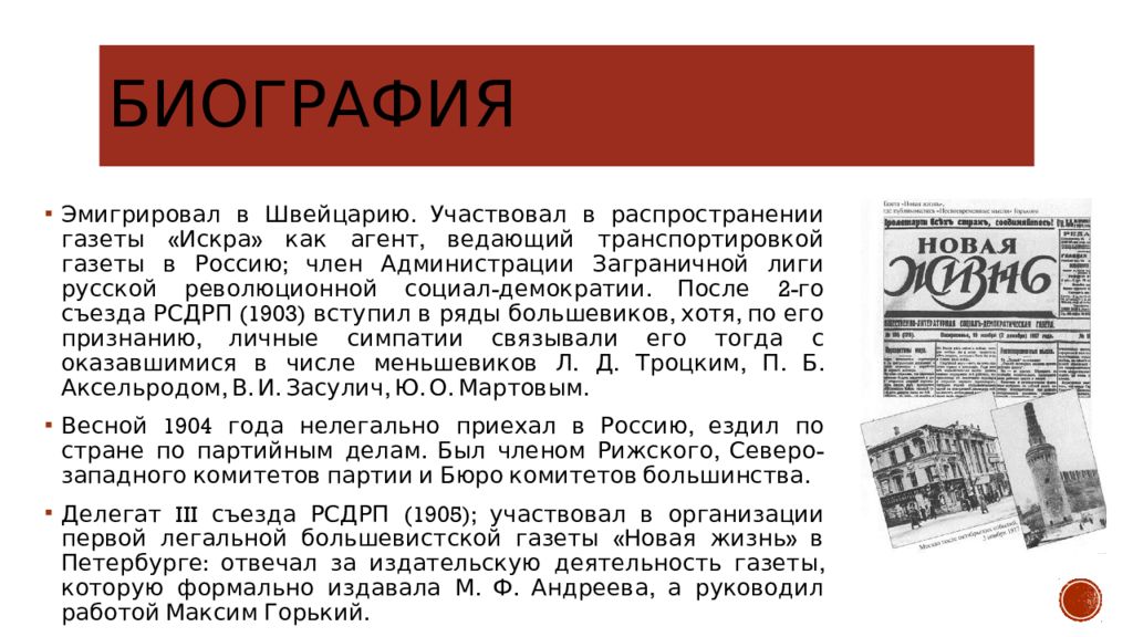 Эмигрировал в Швейцарию. Участвовал в распространении газеты «Искра» как агент, ведающий транспортировкой газеты в Россию; член Администрации Заграничной лиги русской революционной социал-демократии. После 2-го съезда РСДРП (1903) вступил в ряды большевиков, хотя, по его признанию, личные симпатии связывали его тогда с оказавшимися в числе меньшевиков Л. Д. Троцким, П. Б. Аксельродом, В. И. Засулич, Ю. О. Мартовым. Весной 1904 года нелегально приехал в Россию, ездил по стране по партийным делам. Был членом Рижского, Северо-западного комитетов партии и Бюро комитетов большинства. Делегат III съезда РСДРП (1905); участвовал в организации первой легальной большевистской газеты «Новая жизнь» в Петербурге: отвечал за издательскую деятельность газеты, которую формально издавала М. Ф. Андреева, а руководил работой Максим Горький.