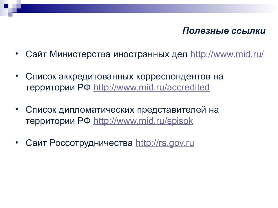 Сайт Министерства иностранных дел http://www.mid.ru/ Список аккредитованных корреспондентов на территории РФ http://www.mid.ru/accredited Список дипломатических представителей на территории РФ http://www.mid.ru/spisok Сайт Р оссотрудничества http://rs.gov.ru