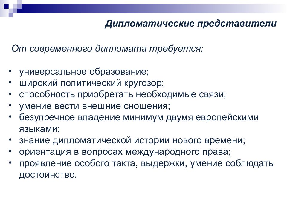 От современного дипломата требуется : универсальное образование ; широкий политический кругозор ; способность приобретать необходимые связи ; умение вести внешние сношения ; безупречное владение минимум двумя европейскими языками ; знание дипломатической истории нового времени ; ориентация в вопросах международного права ; проявление особого такта, выдержки, умение соблюдать достоинство.