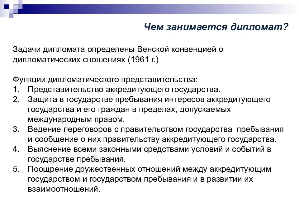 З адачи дипломата определены Венской конвенцией о дипломатических сношениях (1961 г.) Функции дипломатического представительства: П редставительство аккредитующего государства. Защита в государстве пребывания интересов аккредитующего государства и его граждан в пределах, допускаемых международным правом. В едение переговоров с правительством государства пребывания и сообщение о них правительству аккредитующего государства. В ыяснение всеми законными средствами условий и событий в государстве пребывания. Поощрение дружественных отношений между аккредитующим государством и государством пребывания и в развитии их взаимоотношений.