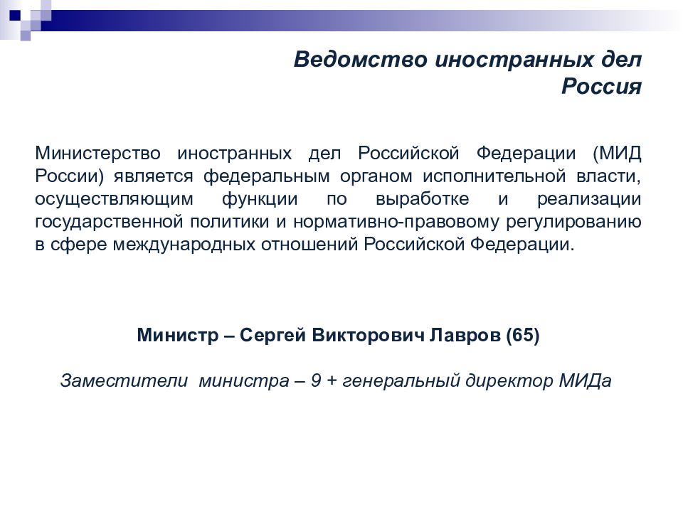 Министерство иностранных дел Российской Федерации (МИД России) является федеральным органом исполнительной власти, осуществляющим функции по выработке и реализации государственной политики и нормативно-правовому регулированию в сфере международных отношений Российской Федерации. Министр – Сергей Викторович Лавров (65) Заместители министра – 9 + генеральный директор МИДа