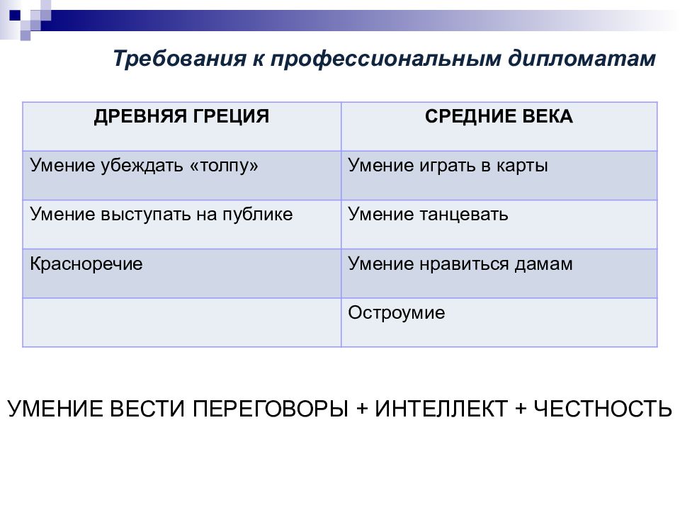 ДРЕВНЯЯ ГРЕЦИЯ СРЕДНИЕ ВЕКА У мение убеждать «толпу» У мение играть в карты У мение выступать на публике У мение танцевать К расноречие У мение нравиться дамам О строумие У МЕНИЕ ВЕСТИ ПЕРЕГОВОРЫ + ИНТЕЛЛЕКТ + ЧЕСТНОСТЬ